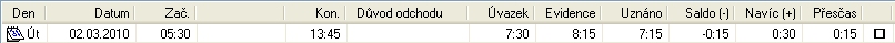 Jedná se o pondělí, 1.3.2010, pracovník přišel v 5:45 a odešel ve 14:15 a jako důvod